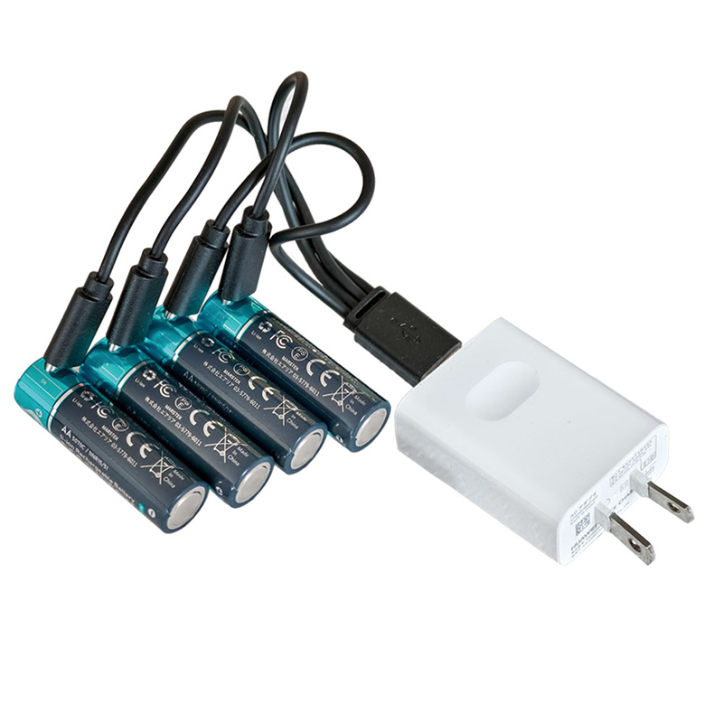 従来の充電池にあった専用の充電器は不要。本製品には4本の電池を1つのUSBで充電できるケーブルを付属しています。