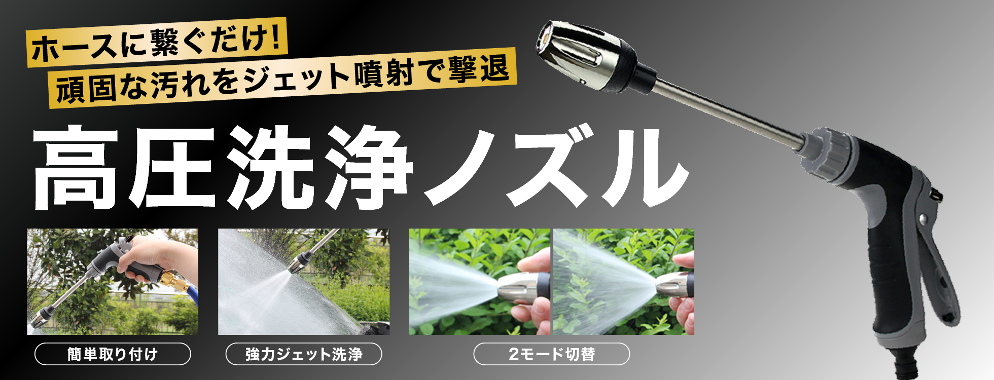 市販のホースに取り付けて使える高圧洗浄ノズル。ジェット噴射で、こびりついた汚れもしっかり落とせます。“拡散”と“ストレート”の2つのモードに切り替えが可能です。