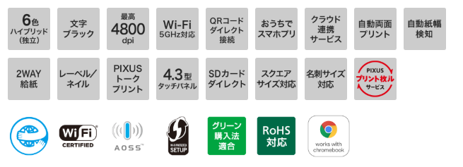 | 用紙サイズ | A4、レター、はがき、L判、2L判、六切、KG、スクエア(127mm×127mm)、スクエア(89mm×89mm)、名刺 | |