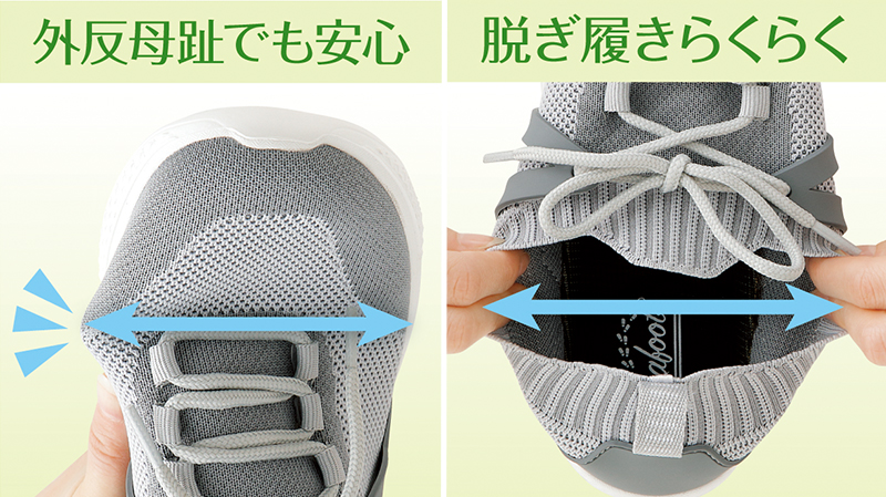 生地にポリエステル/ポリウレタンの伸縮素材を使用。足の動きにフレキシブルに追随するため、母趾(親指の付け根)が圧迫されにくく、外反母趾気味の方にも安心。紐を緩めずにサッと脱ぎ履きできます。
