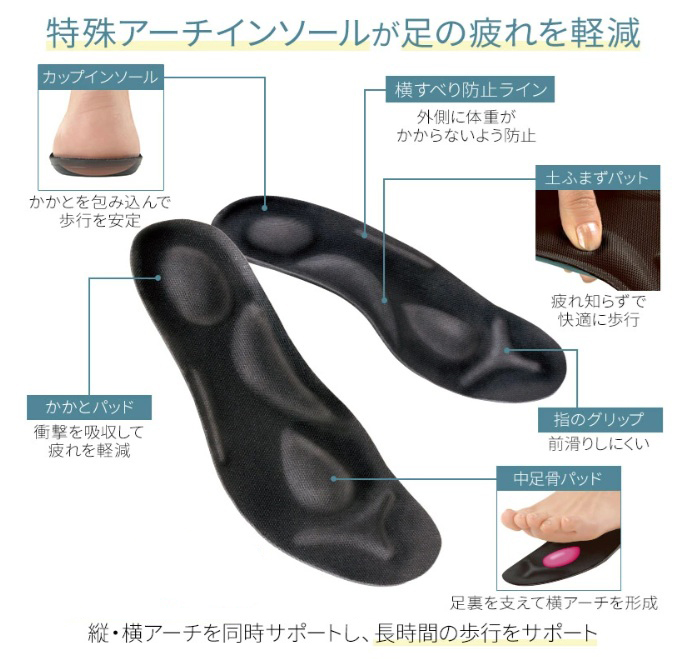 医学博士監修インソール搭載の軽量スニーカー。土踏まずをアウトソール&アッパーのダブルで持ち上げる、長時間でも疲れにくい設計です。ストレッチ素材で脱ぎ履きもスムーズにできます。別色替えひも付きで、気分やスタイルに合わせてカスタマイズも楽しめます。