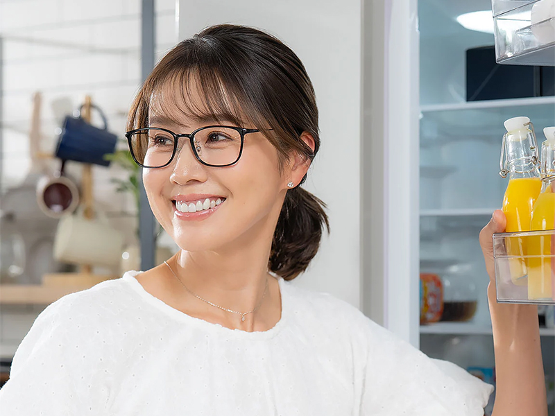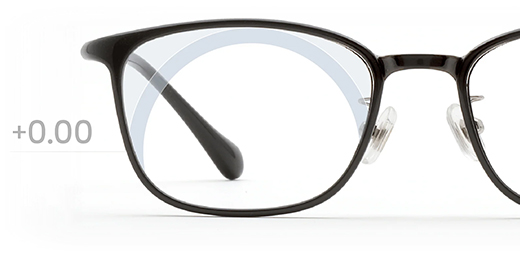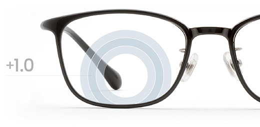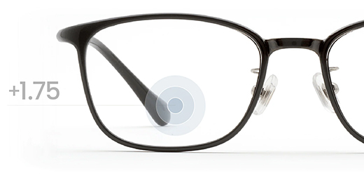 手元を見る時の目線の位置に最も強い度数(+1.75D)を配置し、周辺に向かって徐々に度数を下げるグラデーション構造になった【累進多焦点レンズ】を採用。 境界線がないため視界の歪みが少なくスマホ操作からデスクワーク、対面の会話まで、眼鏡を掛けたままシームレスに使用可能です。