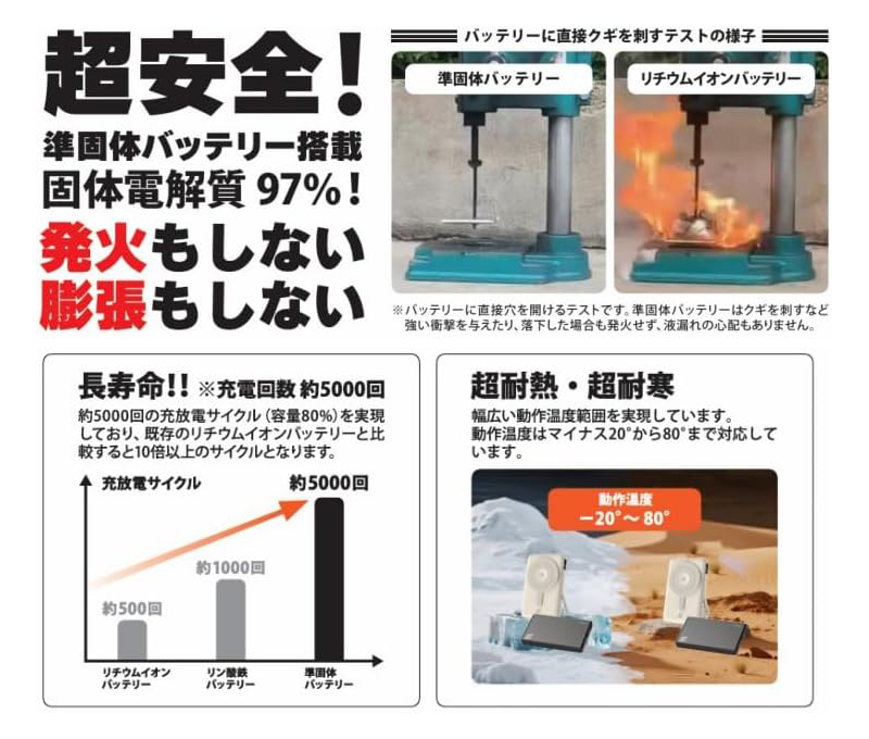 安全性:発火しない、膨張しない