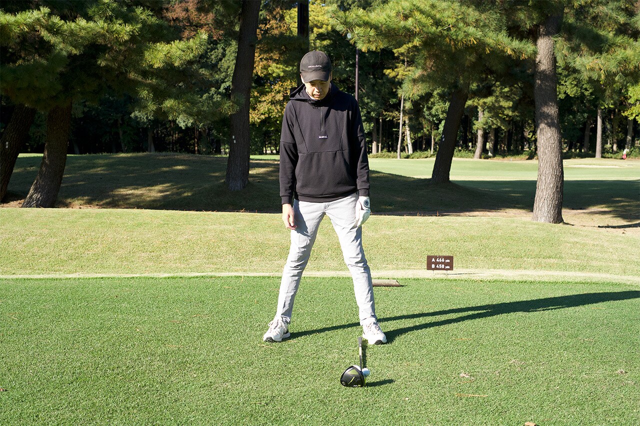 飛ばしたいときほど、アドレスが重要になります。飛距離を出すためには、スタンスをやや広めに取り、バランスを安定させることが大切です。また、ボールの位置は通常よりも少し前方(左足かかと線上)にセットすることで、スイングの最下点を過ぎた位置でインパクトし、ボールを上に上げて飛距離を伸ばすことができます。