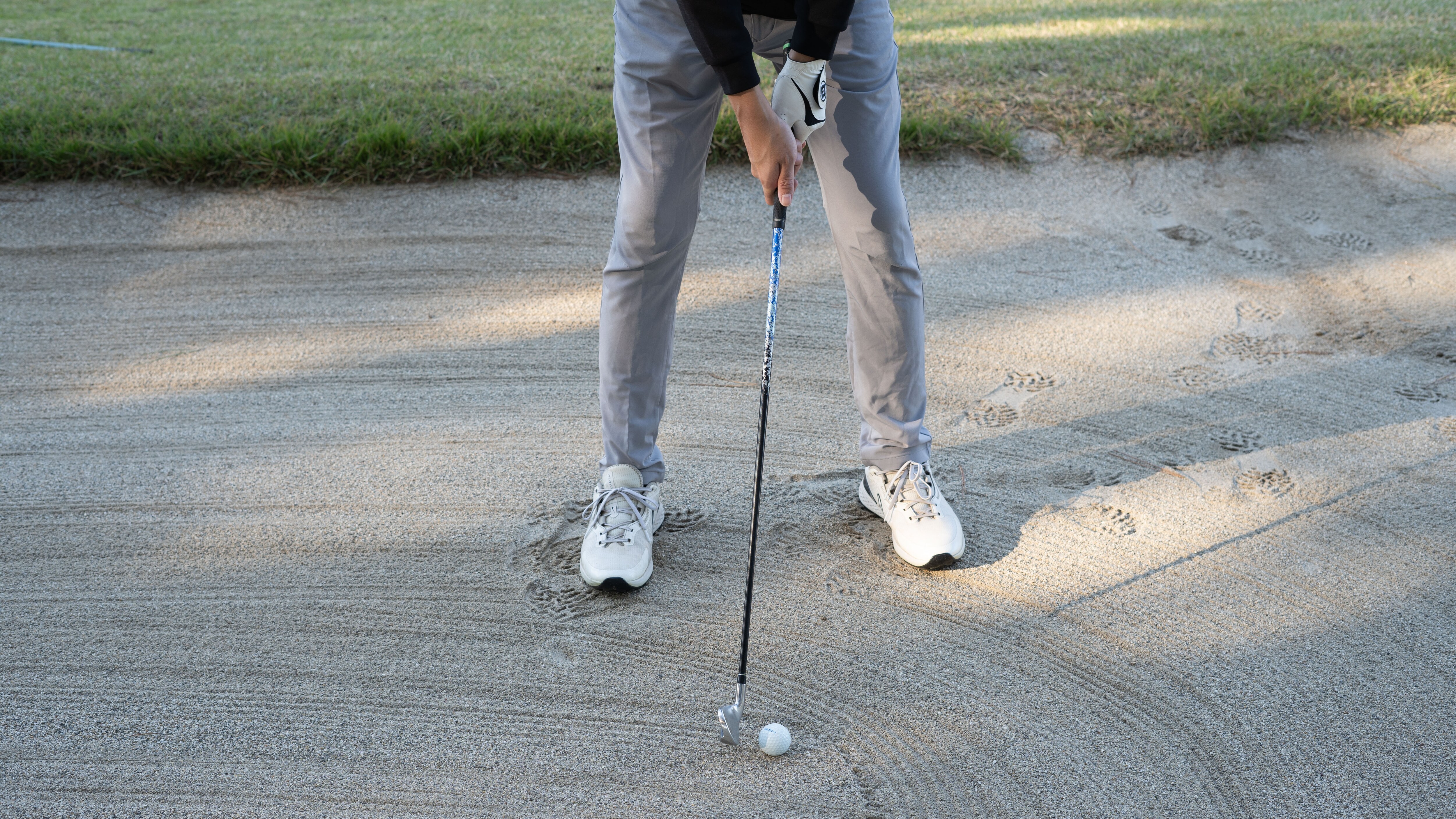 まず、コンパクトに打つために1番手か2番手大きめの番手を持ちます。ミート率をあげるためにクラブはやや短く持ちます。