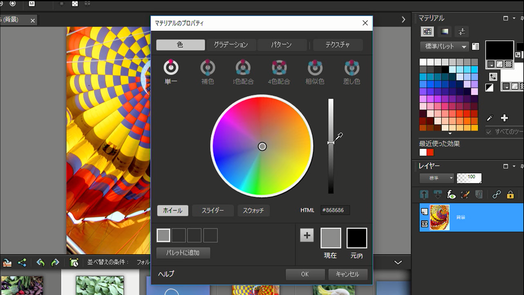 色やグラデーションを設定するマテリアルパレットの使い方がわかります。