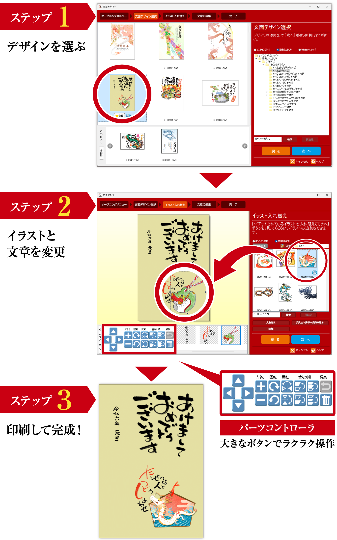 デザインを選んで、イラストや写真を差し替えて、印刷するだけ。わずか3ステップではがきが作れます。