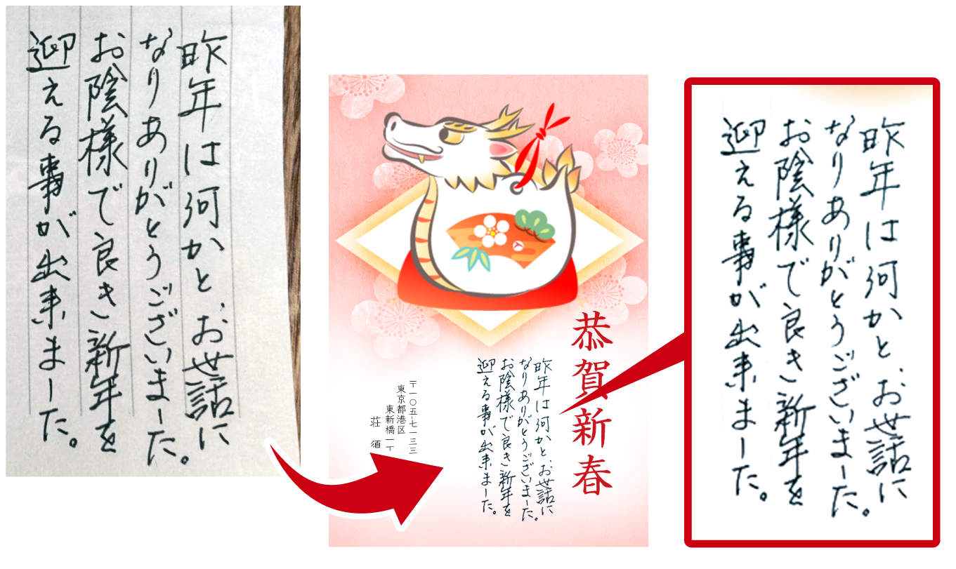 手書き風フォントと組み合わせれば、手書きの一言が入ったような年賀状が完成します。