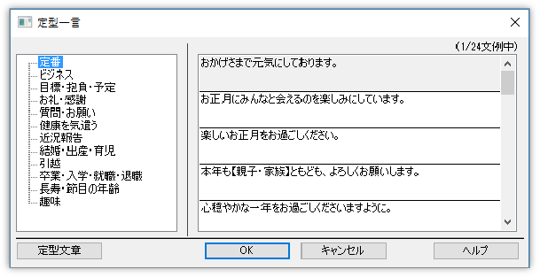 年賀状はもちろん、日常的に使える文例を2,940点収録しています。Ver.36では時代に合わせた挨拶文を追加しました。はがきに手書きする際の参考文例としても活用できます。