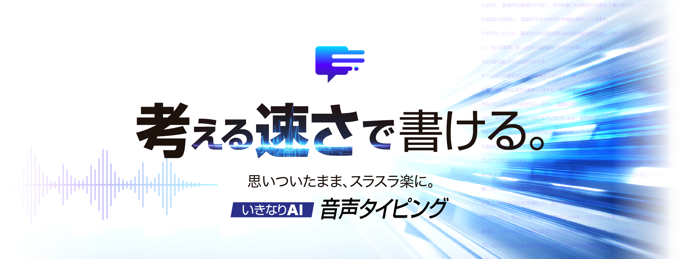 「いきなりAI 音声タイピング」は、声で話すだけでカーソル位置にそのまま文字入力できる音声入力ソフト。思いついたことをその場で書き出せるので、タイピングの手間や速度の限界に縛られず、スムーズに文章作成ができます。