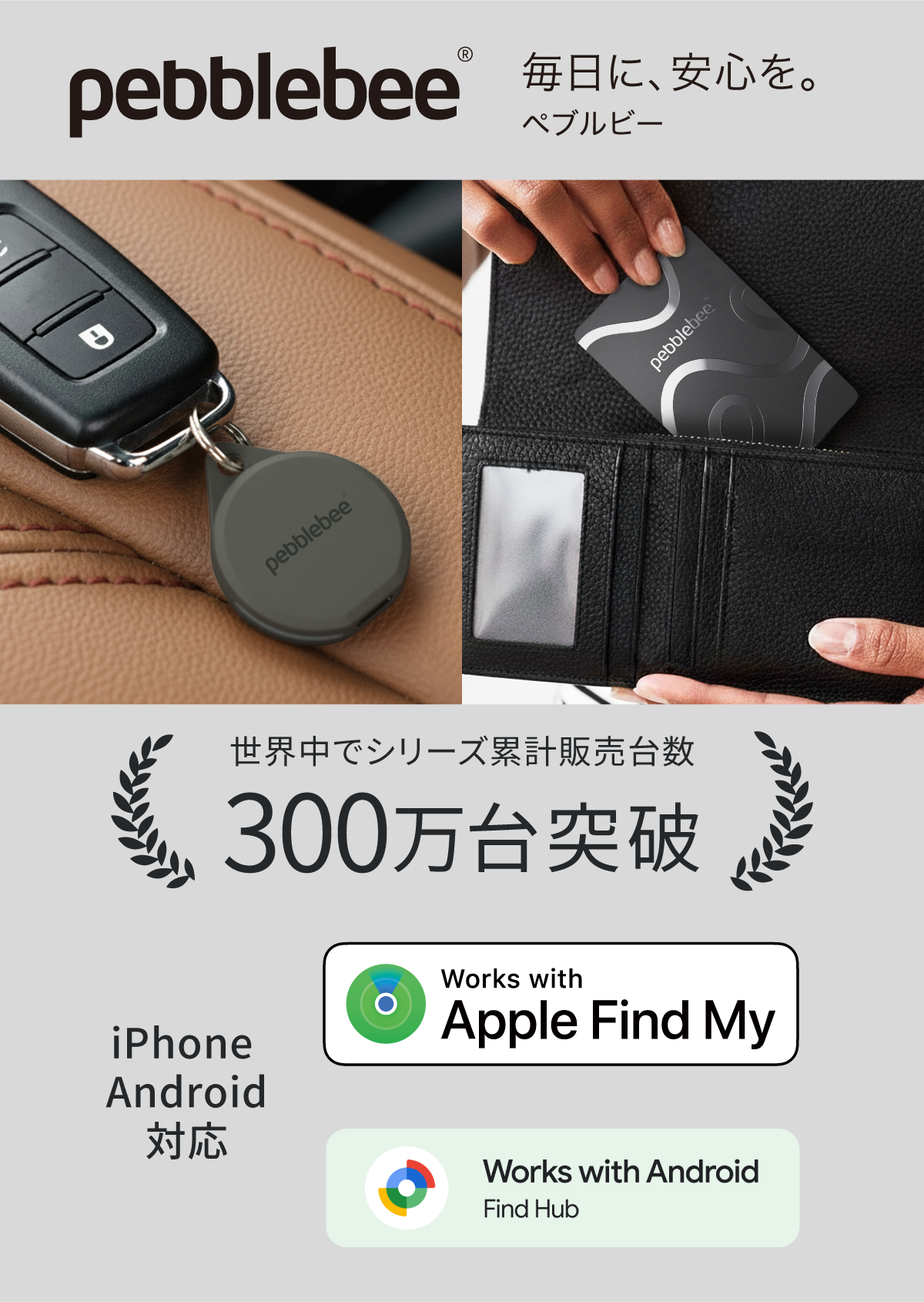 「ぺブルビー」は、iPhoneの"Apple Find My"ネットワークおよびGoogleの"FindHub"ネットワークが定める、セキュリティ基準をクリアしています。 ユーザーのスマホに登録されていないデバイスが移動を共にした場合、自動的に検出・通知される仕組みを標準搭載しています。安全性と利便性を両立しています。
