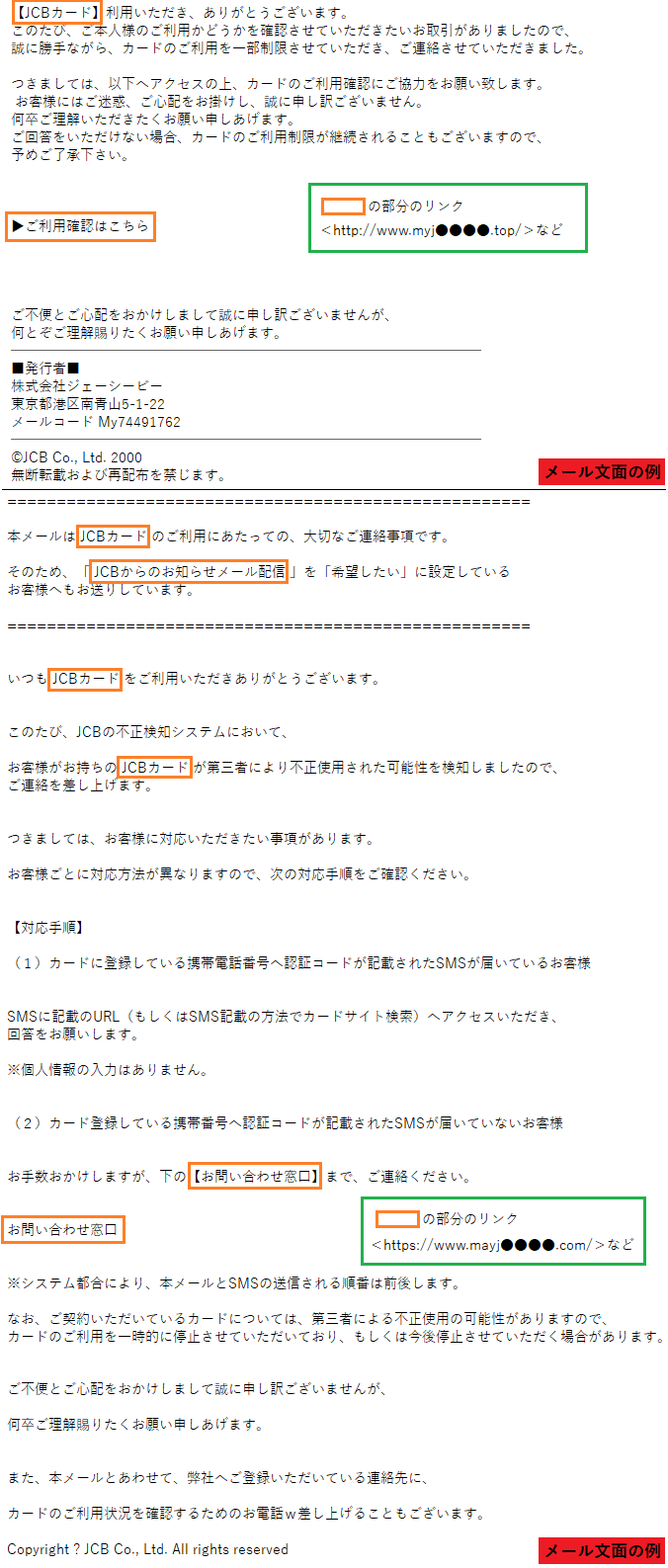 「MyJCBカードの不正利用検知に関する重要な通知」番号:XX-XXXXXXXXXXX