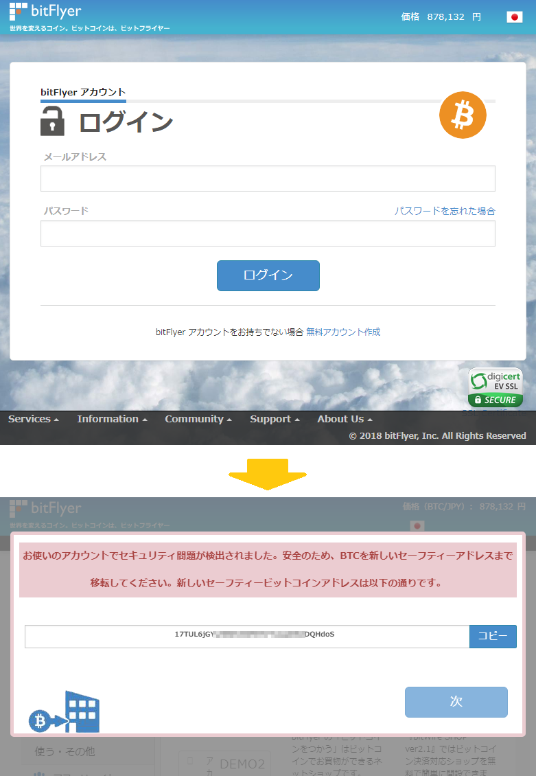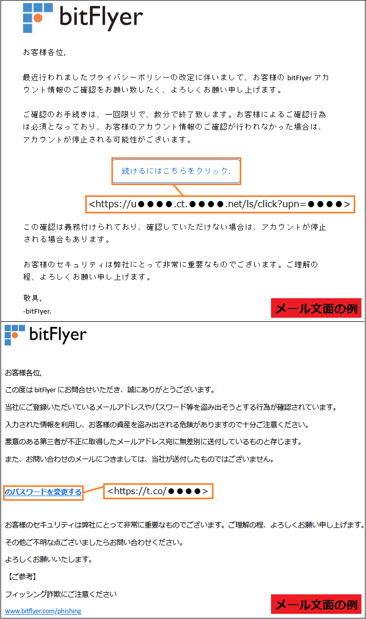 仮想通貨取引所「bitFlyer」を騙るフィッシング詐欺が確認されたため、フィッシング対策協議会が注意を呼びかけています。偽のWebサイトへ誘導してアカウント情報 (メールアドレス・パスワード) を入力させようとするものですのでご注意ください。