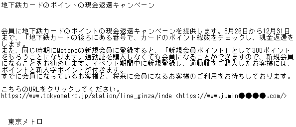「東京メトロ」を騙ったフィッシング詐欺が増加していると、フィッシング対策協議会が注意を呼びかけています。偽のWebサイトへ誘導してカード情報を入力させたり、不審なファイルのダウンロードやインストールをさせようとするものです。ご注意ください。
