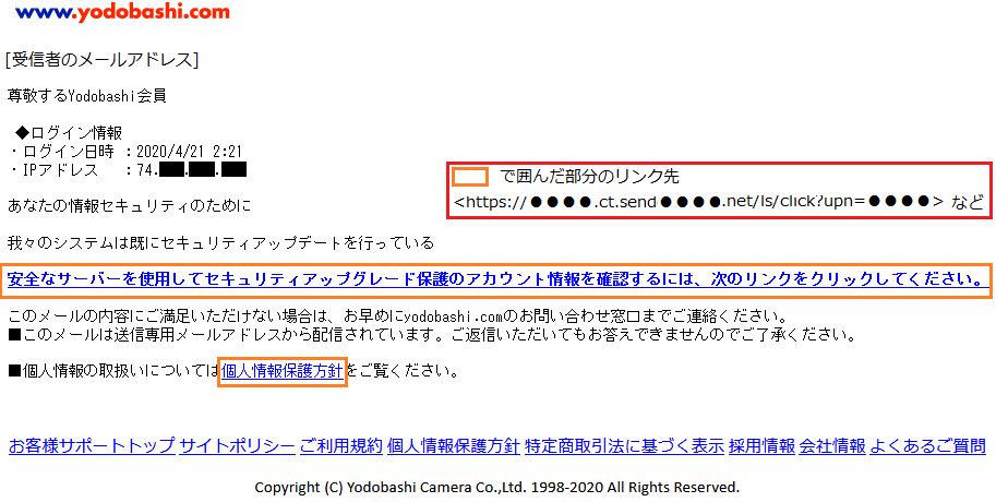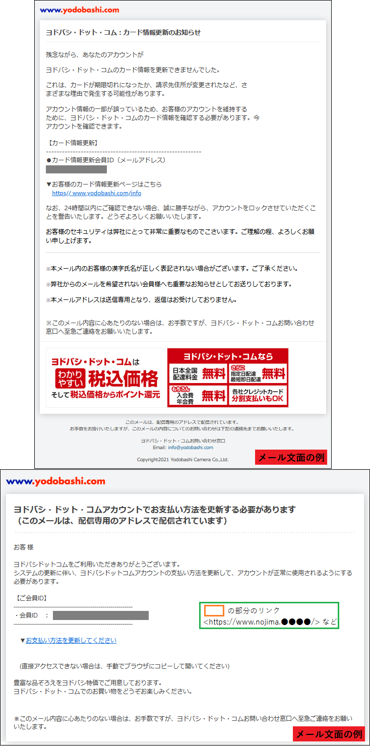 「ヨドバシカメラ」を騙ったフィッシング詐欺が増加していると、フィッシング対策協議会が注意を呼びかけています。言葉巧みな件名やメール本文で、 偽のWebサイトへ誘導してログイン情報や個人情報(名前、カード番号、住所など) を入力させようとするものです。ご注意ください。