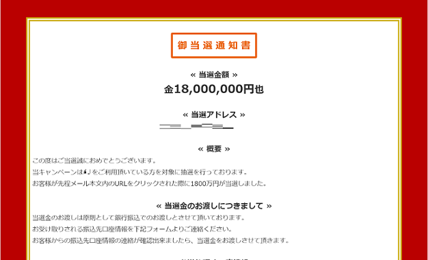 1. 当選詐欺サイトへ誘導する不審メール