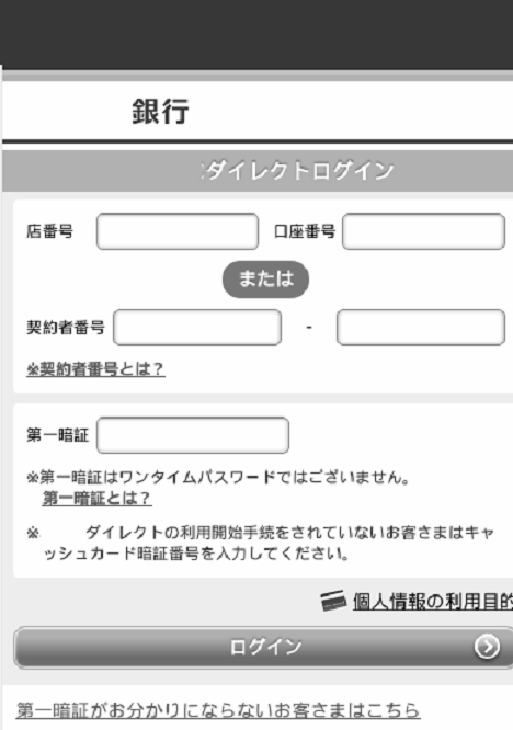 銀行を騙ったフィッシングサイトに誘導され、情報を詐取される。