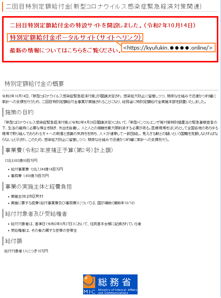 [お知らせ] 二回目特別定額給付金の特設サイトを開設しました。
