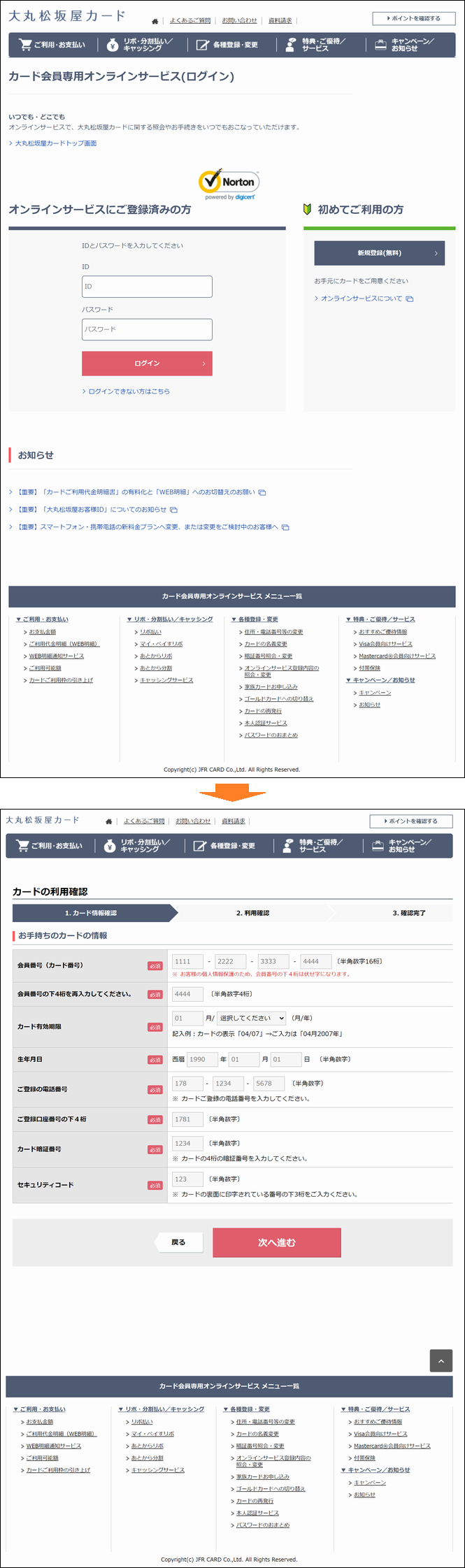 「大丸松坂屋カード」を騙ったフィッシング詐欺が増加していると、フィッシング対策協議会が注意を呼びかけています。偽のwebサイトへ誘導して以下の情報を入力させようとするものですのでご注意ください。