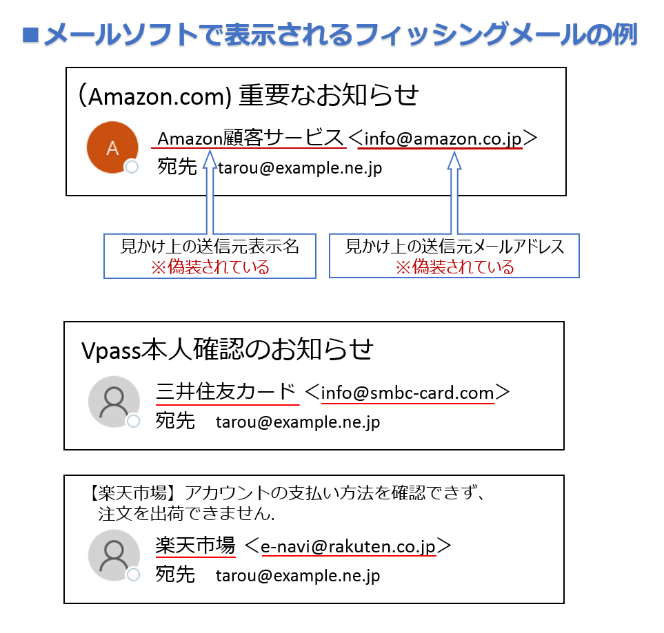 そのため、利用しているサービス名やメールアドレスがいつもと同じであっても、本物とは限りません。
