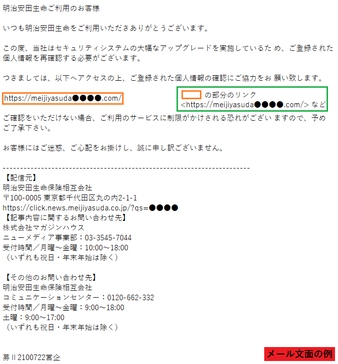 「明治安田生命」を騙ったフィッシング詐欺が増加していると、フィッシング対策協議会が注意を呼びかけています。偽のWebサイトへ誘導して以下の情報を入力させようとするものですのでご注意ください。