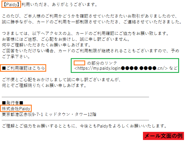 「Paidy」を騙ったフィッシング詐欺が増加していると、フィッシング対策協議会が注意を呼びかけています。偽のwebサイトへ誘導して、メールアドレスや携帯電話番号などをを入力させようとするものですのでご注意ください。