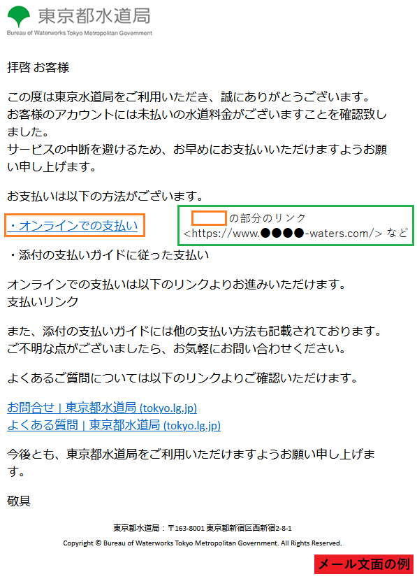「東京都水道局」を騙ったフィッシング詐欺が増加していると、フィッシング対策協議会が注意を呼びかけています。 偽のwebサイトへ誘導して以下の情報などを入力させようとするものですので、ご注意ください。