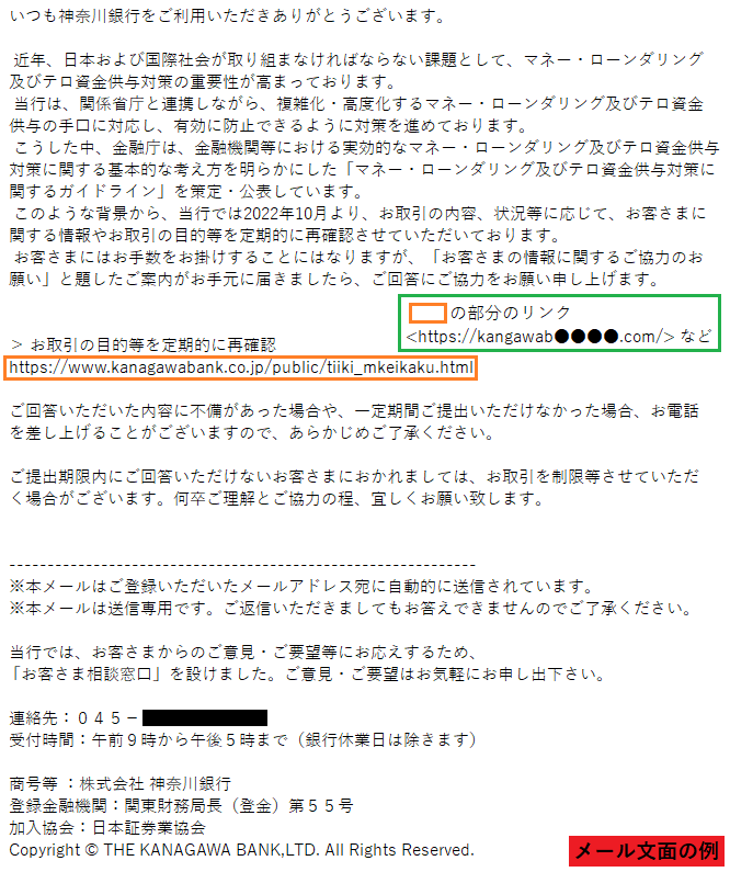 「神奈川銀行」を騙ったフィッシング詐欺が増加していると、フィッシング対策協議会が注意を呼びかけています。偽のwebサイトへ誘導してログイン情報などを入力させようとするものですのでご注意ください。