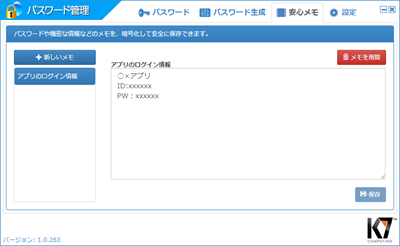 暗号化できるメモ機能です。重要な情報を安心して記録しておけます。
