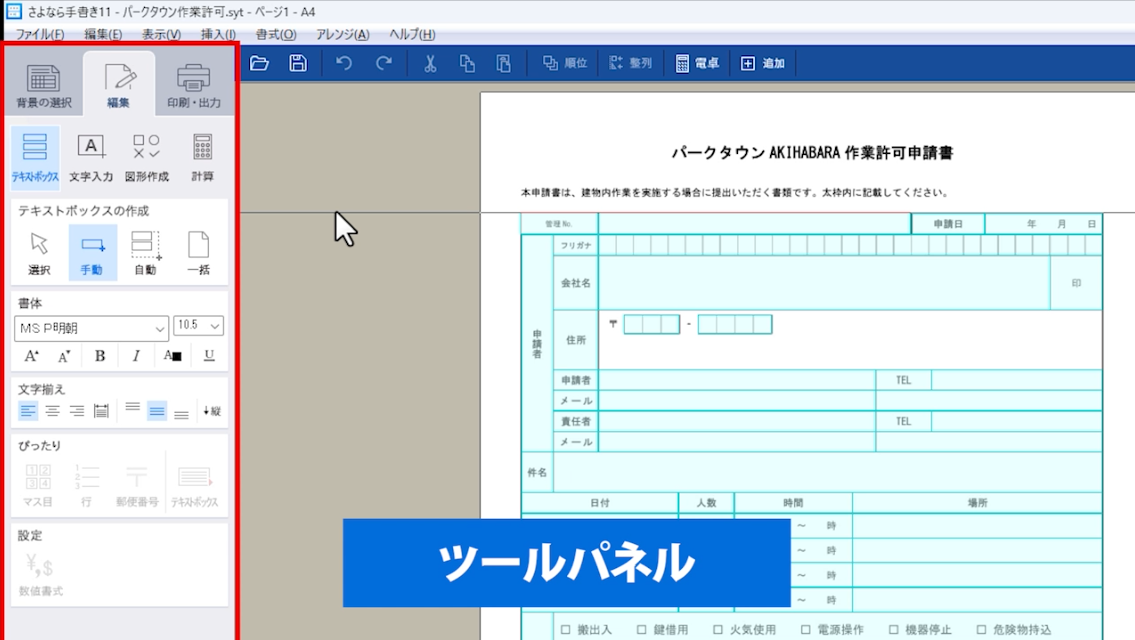 内容 ■1章 さよなら手書きでできること 1-1 さよなら手書きでできること 1-2 画面構成 ■2章 背景の選択 2-1 PDFからの読み込み 2-2 スキャナーで読み込み 2-3 スマートフォンから読み込み 2-4 画像ファイルを読み込み ■3章 編集 3-1 テキストボックスの作成 3-2 書式の設定とスタイル 3-3 ピッタリ機能 3-4 図形作成機能 ■4章 印刷と出力 4-1 印刷と出力 4-2 ファイルへの出力 ■5章 その他の便利な使い方 5-1 差込印刷 5-2 効率的な編集 5-3 背景の編集 5-4 その他の便利な入力機能 5-5 ファイルの保存とパスワードの設定