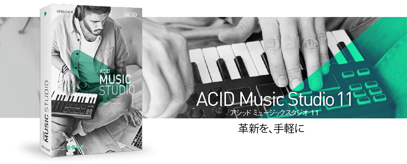 「ACID Music Studio 11」は、世界中のスタジオで使われるプロ用作曲ソフト「ACID PRO 9」のテクノロジーをベースに、より幅広いユーザーに使いやすく、お求めやすくしたソフトです。