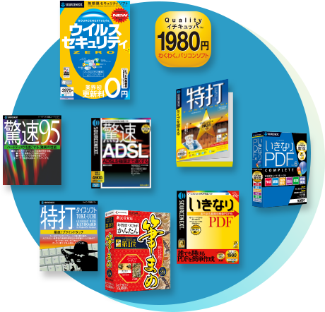 1996年に初の製品である「驚速」、翌年発売のタイピングソフト「特打」の大ヒットからソースネクストのPCソフトウェアの歴史は始まりました。以降、2003年からは大半の製品を1,980円という低価格に統一し、その中の「いきなりPDF」は17年連続でシェア1位を獲得しています。2006年には業界の常識だったウイルス対策ソフトの年間更新料を撤廃して世間に驚きを与えました。