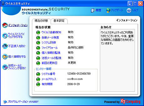いつも「ウイルスセキュリティ」をご利用いただき、ありがとうございます。弊社では、2005年12月16日(金)に「ウイルスセキュリティ2006」を発売予定です。発売に先立ちまして、現在お使いの「ウイルスセキュリティ」を、自動アップデートでバージョンアップ(無料)します。