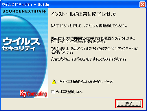 - 以下の画面が表示されると、インストール完了です。「終了」ボタンをクリックして、パソコンを再起動します。