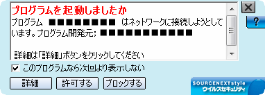 プログラムがインターネットに接続しようとした際には、以下のような画面が表示され、心当たりのない通信はブロックできます。