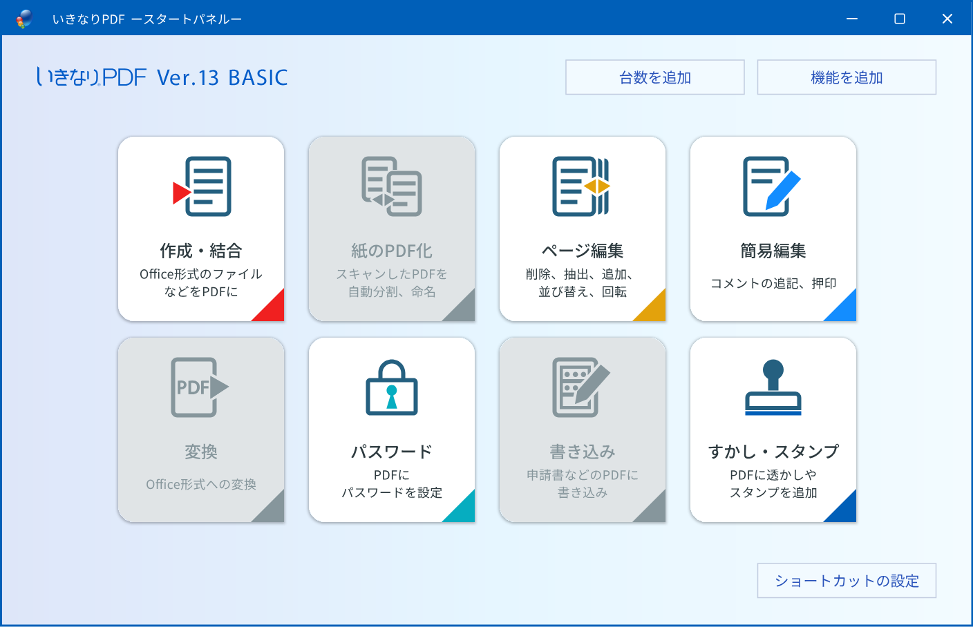 "スタートパネル"を使いやすく刷新 「いきなりPDF」の特長である"スタートパネル"を、より見やすく、使いやすくしました。よく使う機能をアプリケーションごとにまとめて表示しており、目的の操作をすぐに見つけられます。