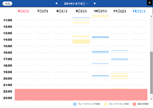 一週間のうち、パソコンを使用していた時間帯と、そのうちブルーライト削減を使用していた時間帯をグラフで確認できます。