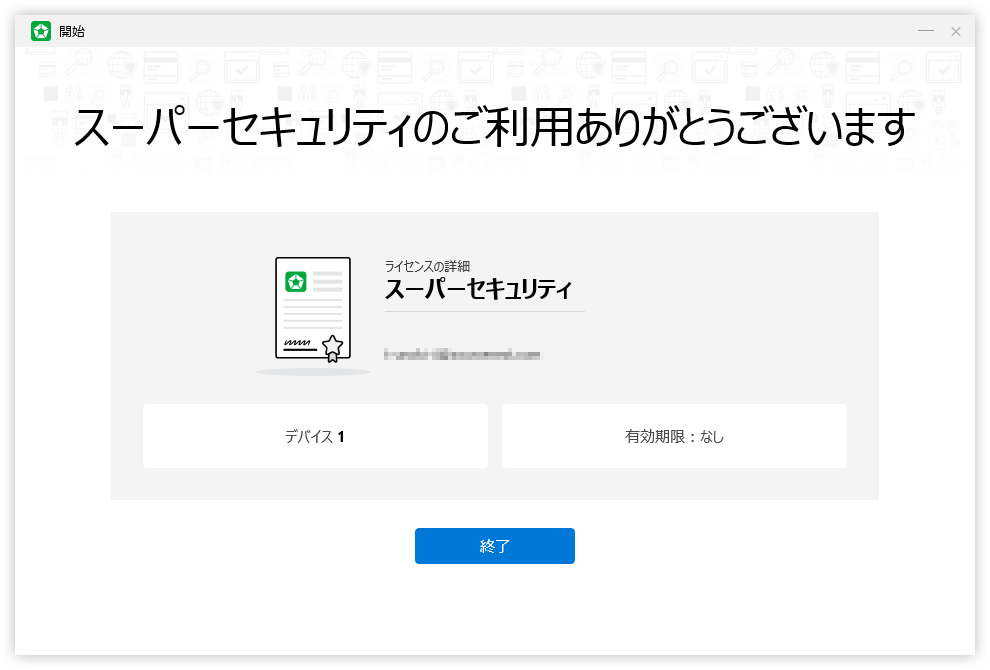 9. インストール完了画面で[スーパーセキュリティの利用を開始する]をクリックします。