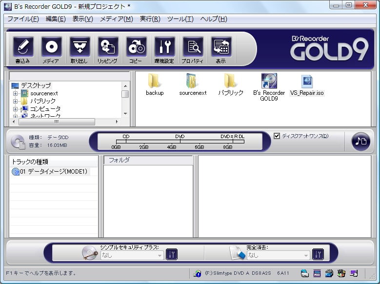 - 「ファイルの場所」でデスクトップの「VS_Repair.iso」を選択し、「トラックの種類」の下にドラッグ&ドロップします。